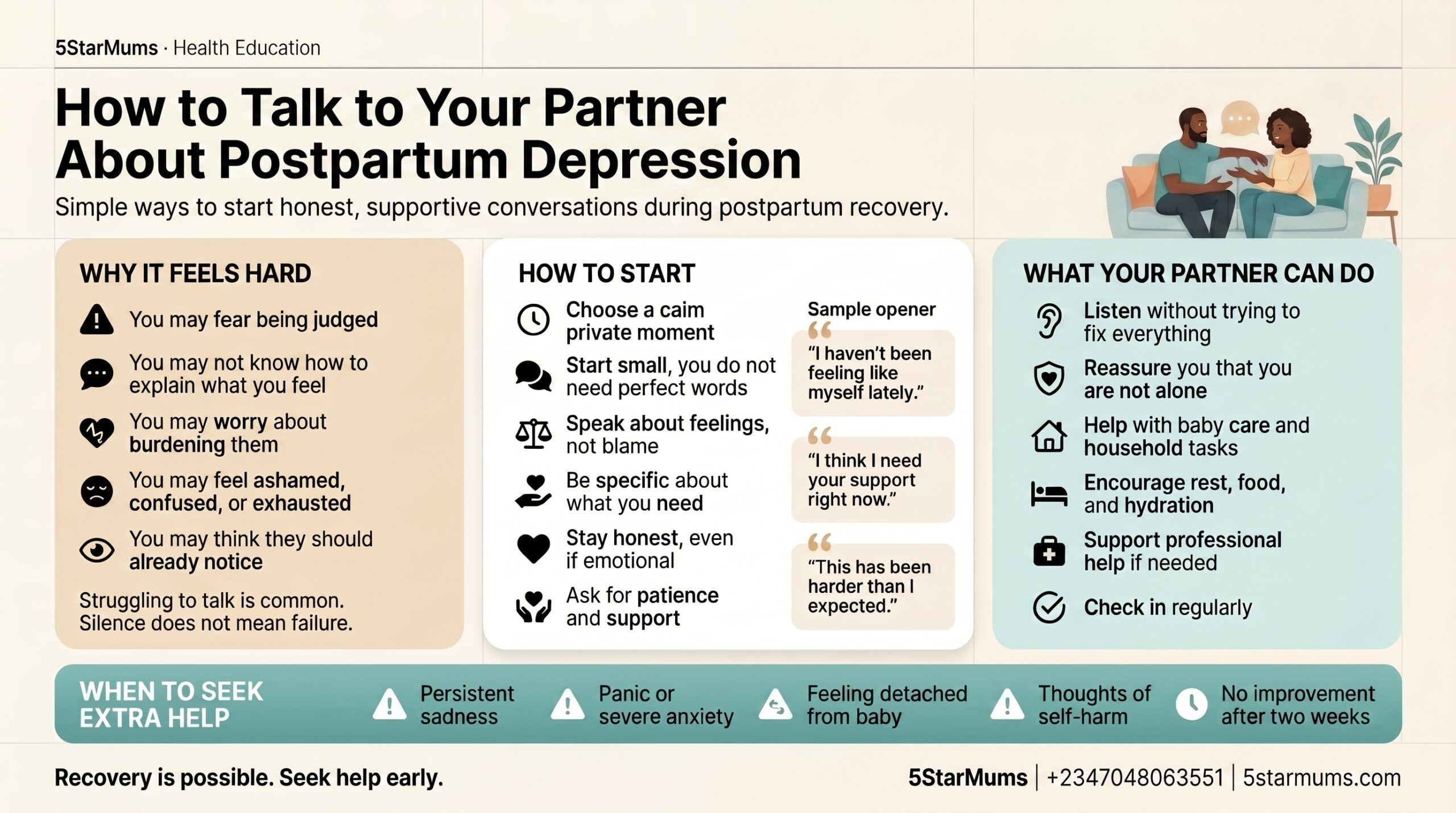 You know something is not right, but you do not know how to explain it. You are tired, overwhelmed, and not feeling like yourself, yet when your partner asks what is wrong, you either say “I am fine” or you keep quiet. Part of you wants support, but another part of you feels they will not understand. You may even worry about being judged or dismissed. If this is where you are, you are not alone. Many new mothers struggle to talk about postpartum depression, especially with the person closest to them.